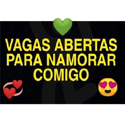 Un corazón verde en la parte superior y texto amarillo que dice 'VAGAS ABERTAS PARA NAMORAR COMIGO' en un fondo negro, con un emoji de dos corazones rojos y un emoji de corazón en los ojos.