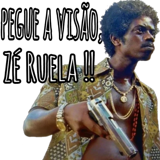 Hombre negro con cabello corto y una pistola en la mano, con camisa de cuadros y cadenas, con el texto "PEGUE A VISÃO, ZÉ RUELA !!" superpuesto.