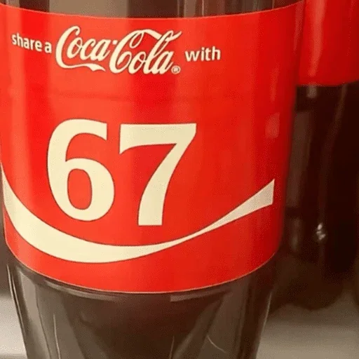 Una botella de Coca-Cola con una etiqueta personalizada que dice 'Share a Coca-Cola with 67', con el número 67 destacado.