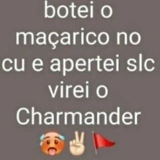 Un texto en portugués con una expresión facial de sorpresa y asombro, acompañado de emojis de una cara sorprendida, un signo de paz y una bandera roja. El texto dice 'botei o maçarico no cu e apertei slc virei o Charmander'.