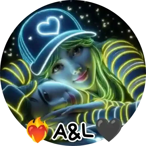 Una mujer con cabello verde y una gorra de neón con un corazón, en un fondo oscuro con estrellas. Ella sonríe y tiene una expresión feliz. El texto 'A&L' y un corazón en llamas aparecen en la parte inferior.