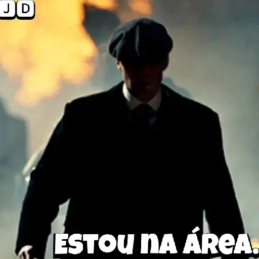 Un hombre con traje y sombrero, con el texto 'ESTOU NA ÁREA.' destacado en la parte inferior. El fondo parece tener una llama o fuego.