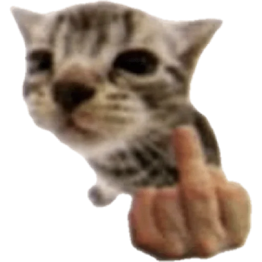Gatito gris con la lengua fuera y una mano humana haciendo un gesto obsceno.