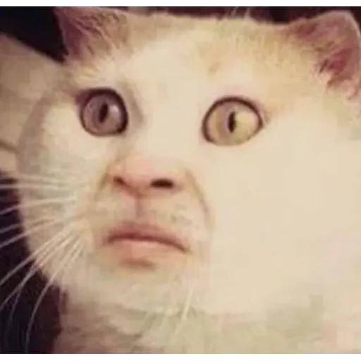Gato branco com expressão facial séria e olhos apertados, parecendo insatisfeito ou desapontado. Fundo desfocado com…