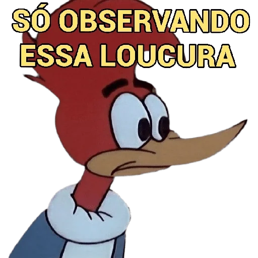Un cartoon de un pájaro con plumas rojas y pico grande, pareciendo sorprendido o confundido, con el texto 'SÓ OBSERVANDO ESSA LOUCURA' en letras amarillas.