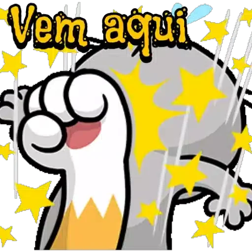 Un dibujo de un animal con la mano levantada y estrellas alrededor, con el texto 'Vem aqui' encima.