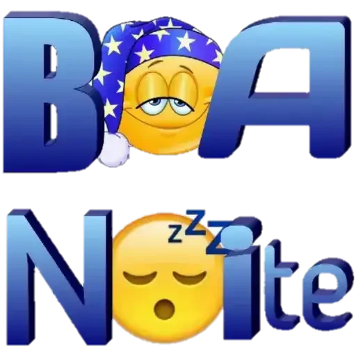 Una figurita con la frase 'Boa Noite' en letras azules degradadas, con emojis de sueño. La 'O' es una cara dormida con un gorro de dormir estrellado, y la 'O' en 'Noite' es un emoji de sueño.
