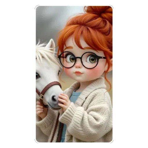 Niña pelirroja con gafas sostiene la cabeza de un caballo blanco.