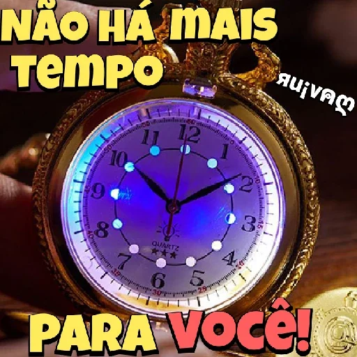 Un reloj de bolsillo con cara azul y luces azules en los números, mostrando horas y minutos. El texto 'NÃO HÁ MAIS TEMPO PARA VOCÊ!' está escrito en amarillo y rojo.