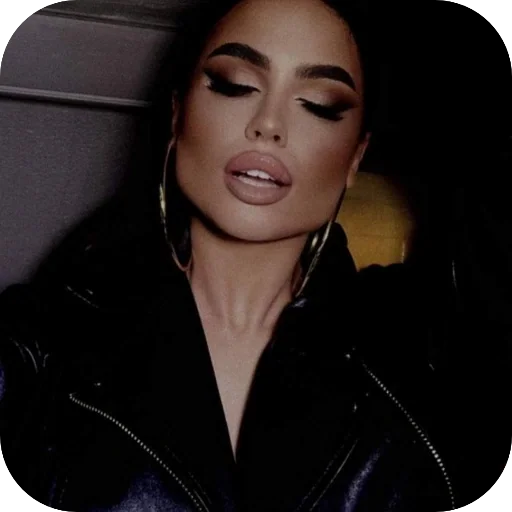 Mujer con ojos cerrados y maquillaje pesado, con chaqueta de cuero negro y pendientes grandes.