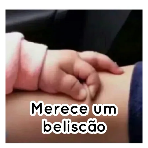 Mano de bebé haciendo un gesto de amor con la mano de un adulto. La leyenda 'Merece um beliscão' está presente en la imagen.