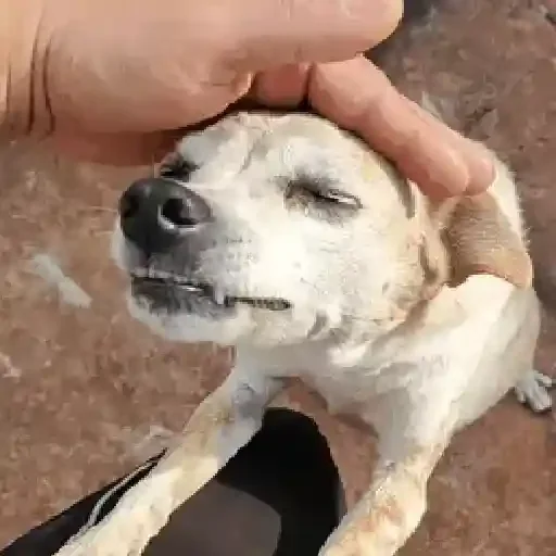 Un perro acostado con los ojos cerrados siendo acariciado en la cabeza por una persona.