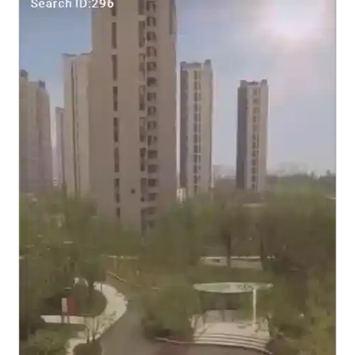 Imagen borrosa de un conjunto de edificios altos en un área urbana con árboles y un espacio verde. El cielo es azul con nubes.