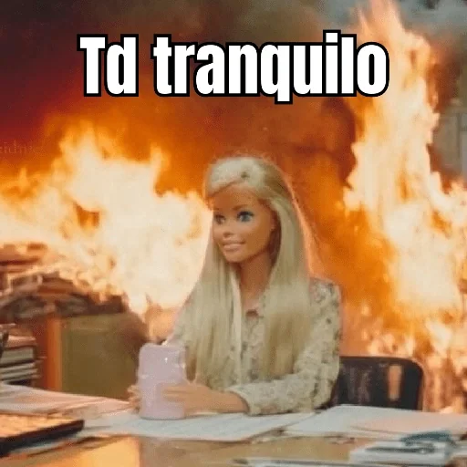 Muñeca Barbie sentada en una mesa con papeles, en medio de un incendio, con expresión tranquila. La imagen tiene el texto 'Td tranquilo' encima.