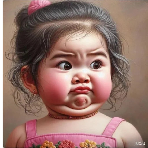Niña con expresión de desapprovalación, mejillas sonrosadas, cabello castaño recogido con un lazo rosa, vestida con una camiseta rosa con flores.