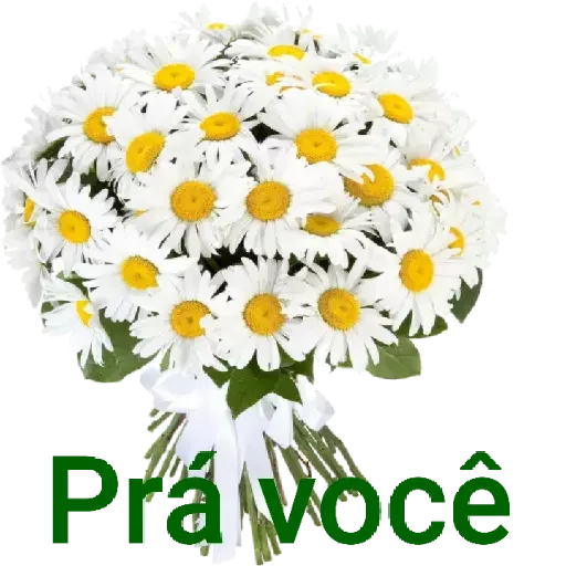 Un ramo de margaritas blancas con centros amarillos, atado con un lazo blanco, con el texto 'Prá você' en verde.