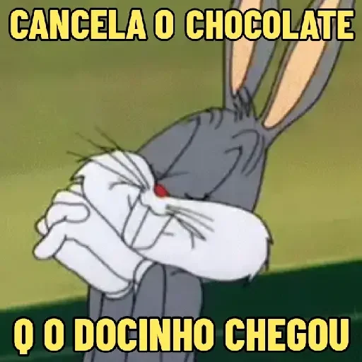 Bugs Bunny con expresión de desaprobación, texto "CANCELA O CHOCOLATE Q O DOCINHO CHEGOU" en amarillo.