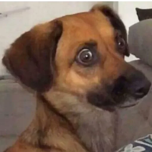 Cachorro com olhos arregalados e expressão surpresa, sentado em frente a um sofá laranja.