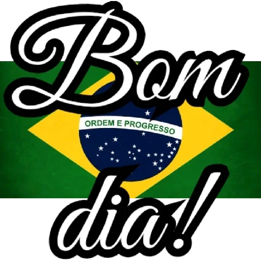 Una figurita con la bandera de Brasil de fondo y el texto 'Bom dia!' en letras cursivas blancas con contorno negro.