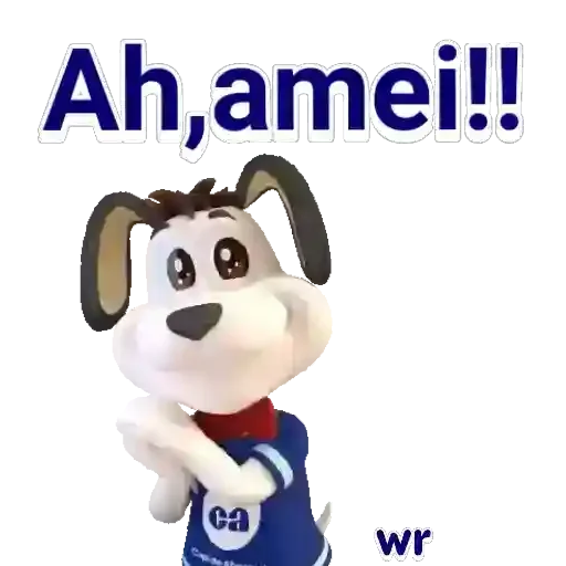 Un perro de dibujos animados con expresión feliz y texto azul 'Ah, amei!!'. Lleva una camisa azul con un logo blanco.