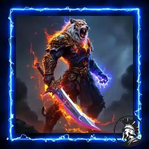 Un tigre con armadura y espada en llamas, rodeado de un aura eléctrica azul. El fondo es oscuro con nubes y llamas.