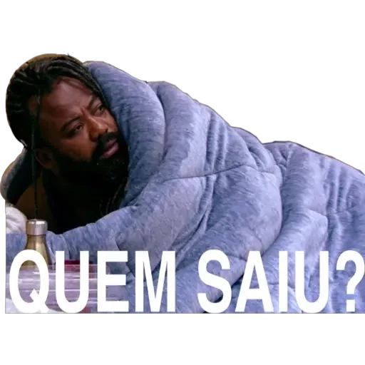 Hombre acostado en una manta morada con una botella, texto 'QUEM SAIU?'