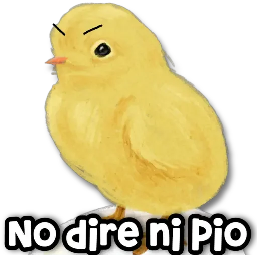 Un pollito amarillo con una expresión de desconfianza o sorpresa, cejas fruncidas y pico ligeramente abierto. Debajo de él, está escrito 'No dire ni Pio'.