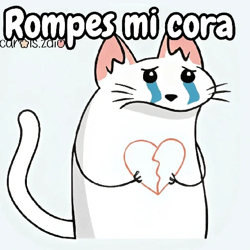 Gato blanco con lágrimas en los ojos y corazón roto delante, con texto 'Rompes mi cora' arriba.