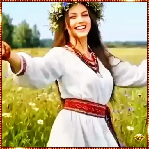 Mujer con vestido blanco y faja roja en la cintura, con corona de flores en la cabeza, sonriendo con los brazos abiertos en un campo de flores.