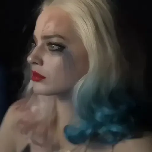 Rosto de Harley Quinn com cabelo metade rosa e metade azul, maquiagem branca e vermelha, e um olhar sedutor. Ela está…