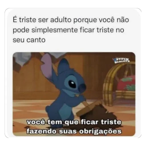 Stitch de Lilo & Stitch sentado tristemente con las manos en la cabeza, rodeado de texto en portugués sobre la tristeza de ser adulto.