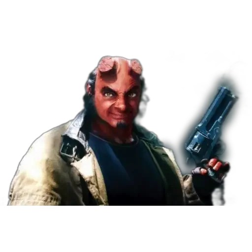 Personaje de película con cabeza roja y cuernos, sosteniendo una pistola.