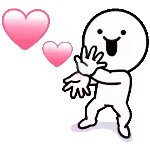 Un personaje de dibujo animado con una gran sonrisa y ojos pequeños, haciendo un gesto con la mano mientras aparecen dos corazones rosados al lado.