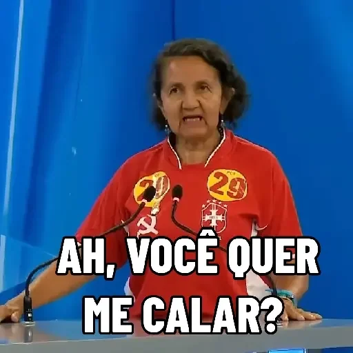Uma mulher mais velha com expressão séria e cabelos castanhos, vestindo um suéter branco com uma faixa escura. Abaixo…