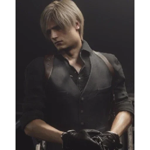 Personagem de jogo com cabelo loiro curto e expressão séria, vestindo roupas escuras.