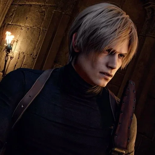 Personagem de jogo de videogame com cabelo loiro e expressão séria, vestindo roupas escuras.