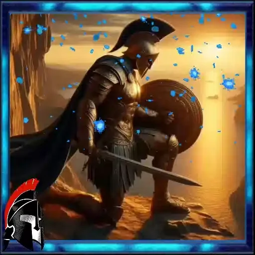 Un guerrero antiguo con armadura y espada en un paisaje impresionante rodeado de partículas azules.