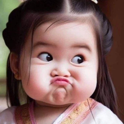 Niña con expresión de sorpresa y mejilla inflada, vistiendo una ropa rosa con detalles en amarillo.