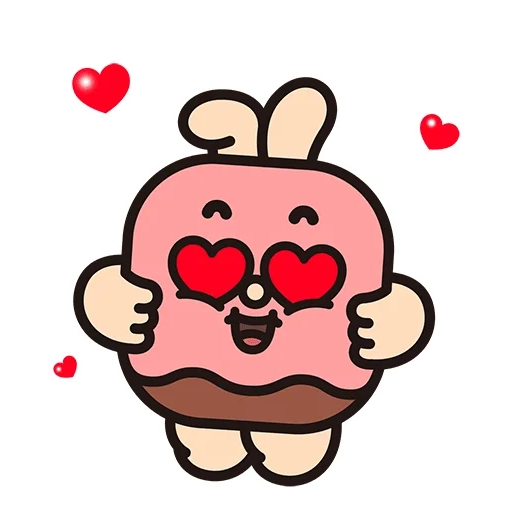 Un donut rosa con ojos de corazón, sonrisa y brazos abiertos, rodeado de corazones rojos.