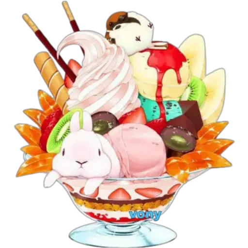 Un tazón de colores con postre con helados, frutas, chocolate y un dibujo de un conejo blanco. También hay un niño de ojos marrones y un par de palillos.