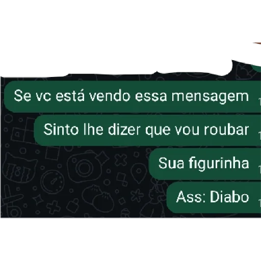 Una imagen de un diálogo ficticio con tres mensajes en portugués. El primer mensaje dice 'Se vc está vendo essa mensagem', el segundo 'Sinto lhe dizer que vou roubar', el tercero 'Sue figurinha' y una firma 'Ass: Diabo'.