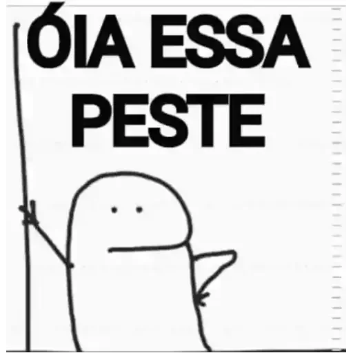 Un dibujo simple de un personaje con expresión neutral, sosteniendo un objeto, con el texto 'ÓIA ESSA PESTE' en letras grandes.