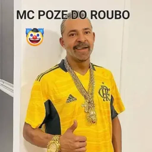 Un hombre sonriendo, con una camiseta amarilla con detalles en negro y una cadena de oro, haciendo un gesto de aprobación con la mano. Hay texto 'MC POZE DO ROUBO' sobre su cabeza.