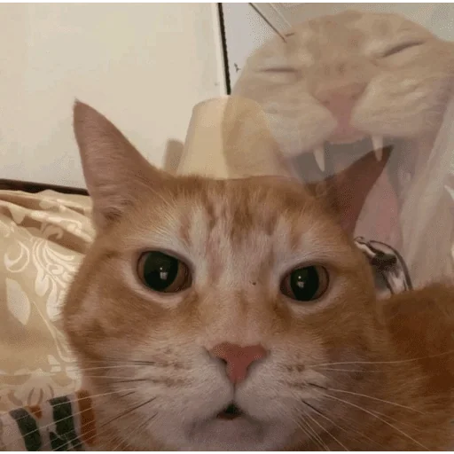 Rosto de um gato com olhos grandes e arregalados, focados para o lado esquerdo, com focinho rosa e bigodes brancos.
