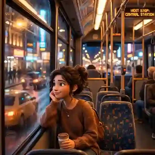 Mujer sentada en un autobús por la noche, mirando por la ventana con una taza en la mano, usando un suéter marrón. El autobús tiene asientos vacíos y luces de ciudad al fondo.