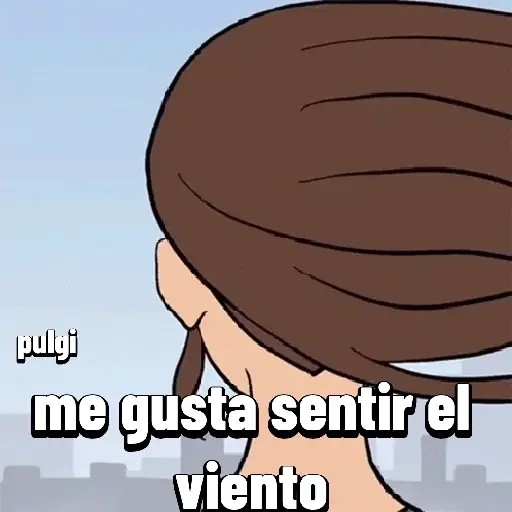 Una mujer de pelo marrón mirando hacia el horizonte con el texto "me gusta sentir el viento" superpuesto. El fondo muestra una ciudad a lo lejos bajo un cielo claro.