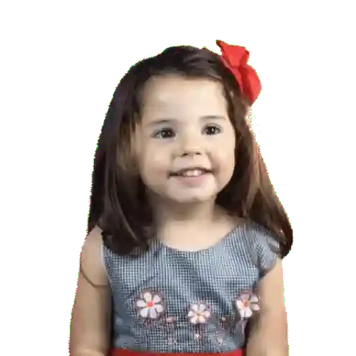 Niña con cabello castaño y un lazo rojo en el cabello, usando una blusa gris con flores blancas y rojas.
