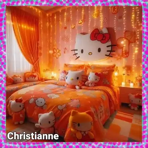 Dormitorio decorado con cobertor y almohadas naranjas con estampados de Hello Kitty, cortinas naranjas, luces y una gran cabeza de Hello Kitty en la pared. El nombre 'Christianne' aparece en la parte inferior izquierda.