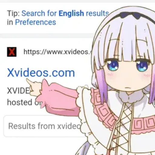 Niña de anime con cabello morado y blanco y ojos azules señala un enlace a un sitio de videos para adultos.