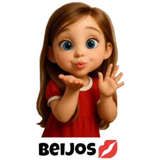 Niña de pelo castaño y ojos azules, vestida de rojo, haciendo un gesto de beso con la mano. Debajo de ella, dice 'BEIJOS' con un símbolo de un beso.